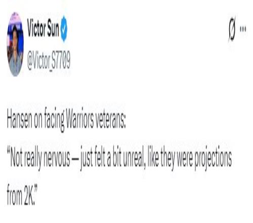 赛后谈到首次在赛场上对阵库里等勇士老将的感受,杨瀚森表示:那倒是不紧张,感觉人有点像是2K里投射出来的。
