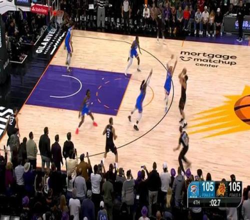 太阳此时场上五个人都有投三分的能力,雷霆没有轻易选择包夹,多尔特在布克的突破路线上等待。布克观察了一下局势,佯装左侧突破,随后撤步三分出手,在多尔特和卡鲁索这对让联盟闻风丧胆的防守组合面前,投进绝杀三分!