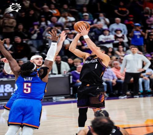 雷霆上半场一度领先18分,但在第二节末尾被太阳打出一波进攻高潮,此后比赛的节奏就一直太阳的手里。布克虽然投篮命中不多,但好在能持续走上罚球线,同时也送出了9次助攻。最后一攻布克选择相信自己的手感,在这之前他一直都在相信队友,其中获益最大的就是打出生涯之夜的乔丹-古德温。